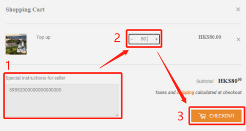3), Complétez le paiement en fonction du prix réel. par exemple. Si le prix du forfait rechargé est de 80 HK$, veuillez définir le nombre de marchandises sur 80.